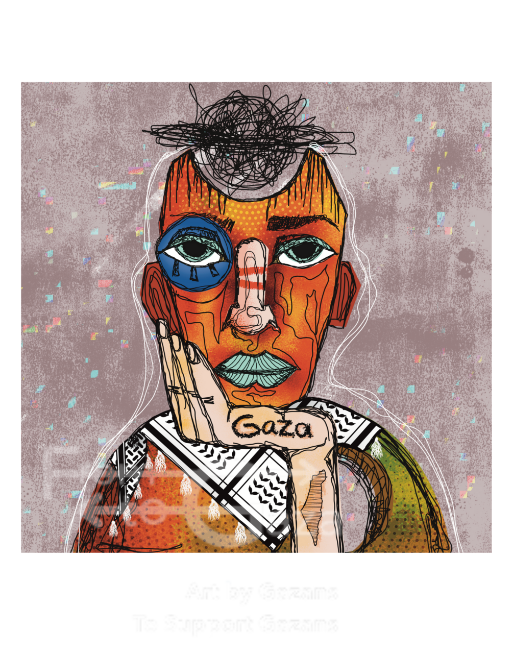 This untitled piece by Ala al-Wadiya shows the deep and tired expression of a surrealistic person, with a keffiyeh around their shoulders, the word "Gaza" imprinted on their palm as they rest their chin in their hand, and the outline of Palestine on their wrist.